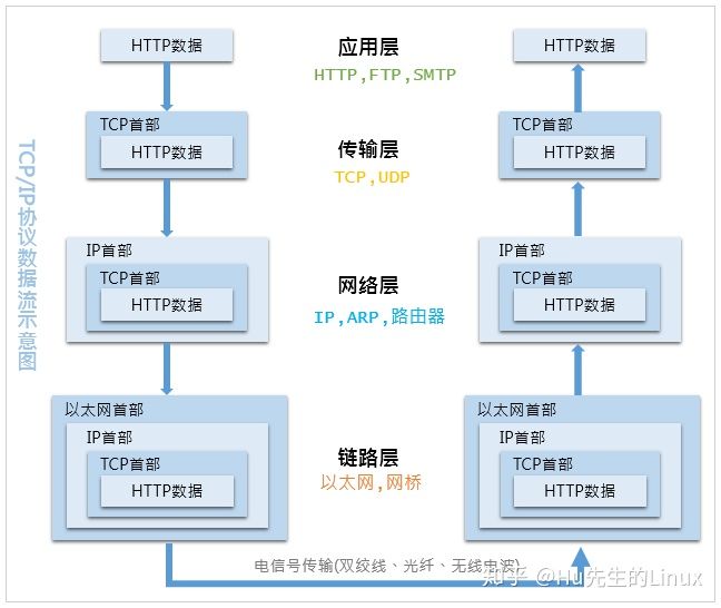 TCP/IP協議棧分為四層,每一層都由特定的協議與對方進行通信,而協議之間的通信最終都要轉化為 0 和 1 的電信號,通過物理介質進行傳輸才能到達對方的電腦,因此物理介質是網絡通信的基石。