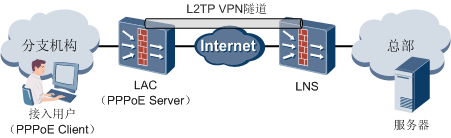 分支機構員工感知不到隧道存在,不需要使用用戶名接入。LAC為分支機構的多個用戶提供L2TP服務,免去了每個用戶使用L2TP都需要先撥號的麻煩。