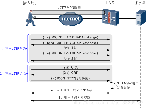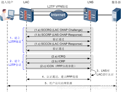 L2TP首先需要建立L2TP隧道,然后在L2TP隧道上建立會話連接,最后建立PPP連接。所有的L2TP需要承載的數據信息都是在PPP連接中進行傳遞的。