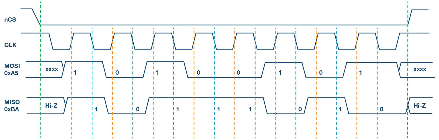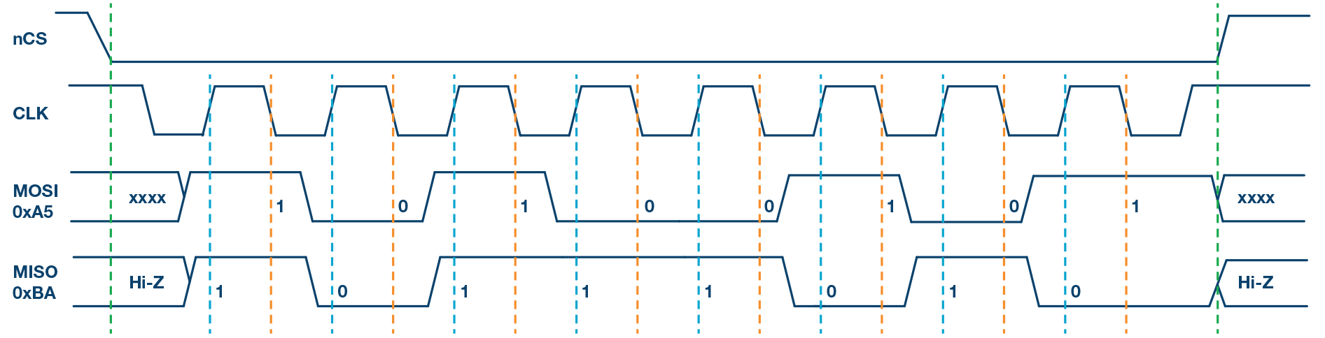 圖3給出了SPI模式1的時序圖。在此模式下,時鐘極性為0,表示時鐘信號的空閑狀態(tài)為低電平。此模式下的時鐘相位為1,表示數(shù)據(jù)在下降沿采樣(由橙色虛線顯示),并且數(shù)據(jù)在時鐘信號的上升沿移出(由藍(lán)色虛線顯示)。