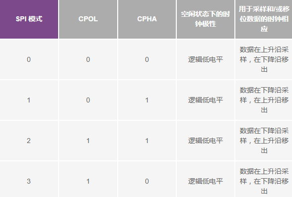 在SPI中,主機(jī)可以選擇時鐘極性和時鐘相位。在空閑狀態(tài)期間,CPOL位設(shè)置時鐘信號的極性。空閑狀態(tài)是指傳輸開始時CS為高電平且在向低電平轉(zhuǎn)變的期間,以及傳輸結(jié)束時CS為低電平且在向高電平轉(zhuǎn)變的期間。CPHA位選擇時鐘相位。根據(jù)CPHA位的狀態(tài),使用時鐘上升沿或下降沿來采樣和/或移位數(shù)據(jù)。主機(jī)必須根據(jù)從機(jī)的要求選擇時鐘極性和時鐘相位。根據(jù)CPOL和CPHA位的選擇,有四種SPI模式可用。表1顯示了這4種SPI模式。