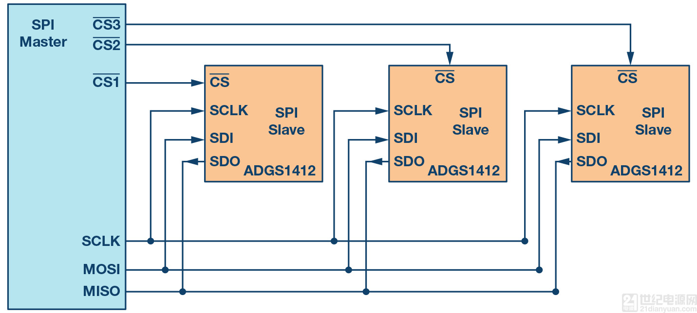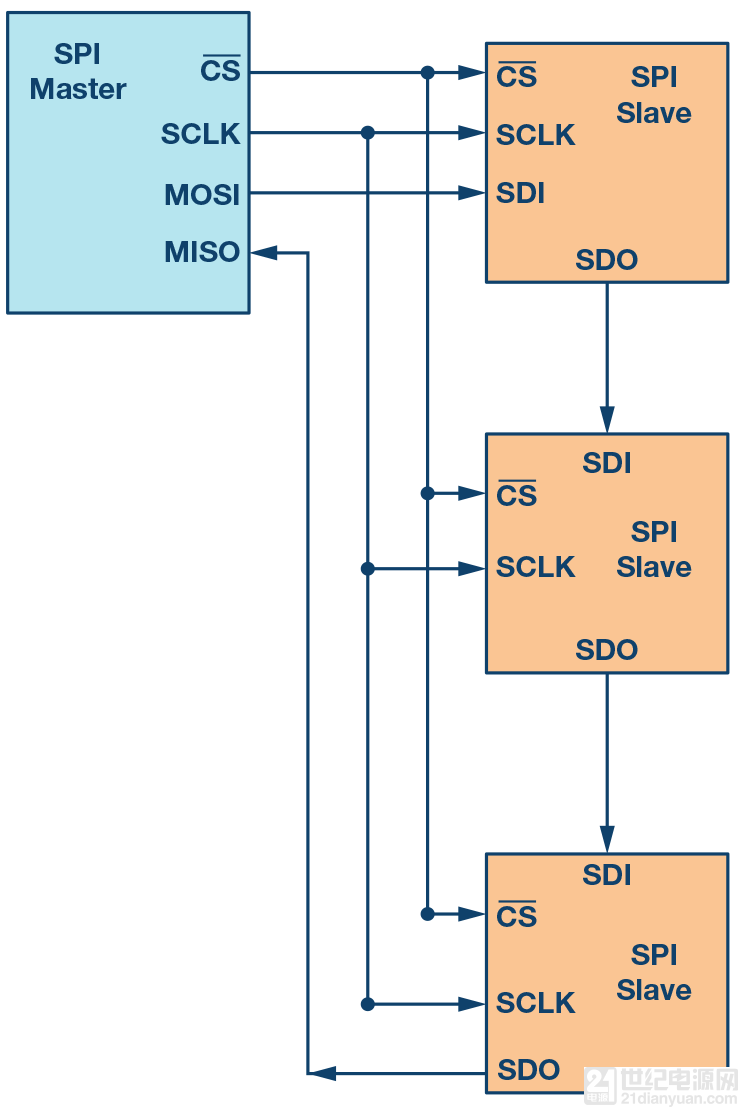 多個從機(jī)可與單個SPI主機(jī)一起使用。從機(jī)可以采用常規(guī)模式連接,或采用菊花鏈模式連接。
