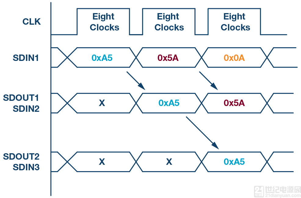 使用該方法時,由于數(shù)據(jù)是從一個從機(jī)傳播到下一個從機(jī),所以傳輸數(shù)據(jù)所需的時鐘周期數(shù)與菊花鏈中的從機(jī)位置成比例。例如在圖7所示的8位系統(tǒng)中,為使第3個從機(jī)能夠獲得數(shù)據(jù),需要24個時鐘脈沖,而常規(guī)SPI模式下只需8個時鐘脈沖。圖8顯示了時鐘周期和通過菊花鏈的數(shù)據(jù)傳播。并非所有SPI器件都支持菊花鏈模式。請參閱產(chǎn)品數(shù)據(jù)手冊以確認(rèn)菊花鏈?zhǔn)欠窨捎谩?br style="word-wrap: break-word; color: rgb(51, 51, 51); font-family: "Microsoft Yahei", "Hiragino Sans GB", "Helvetica Neue", Helvetica, tahoma, arial, Verdana, sans-serif, "WenQuanYi Micro Hei", 宋體; font-size: 14px; white-space: normal; background-color: rgb(250, 250, 250);"/>