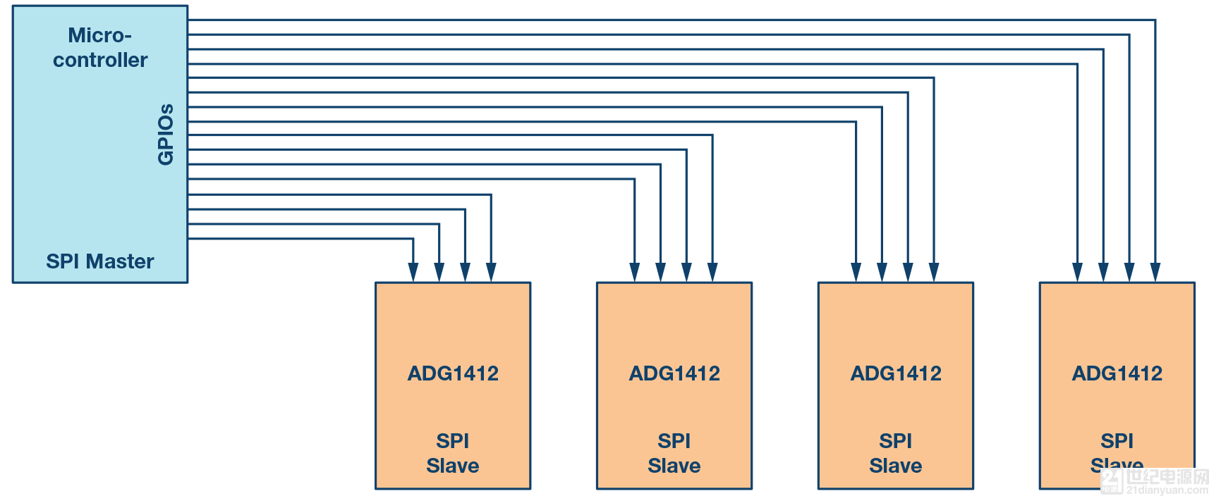 ADG1412 是一款四通道、單刀單擲(SPST)開關(guān),需要四個GPIO連接到每個開關(guān)的控制輸入。圖9顯示了微控制器和一個ADG1412之間的連接。