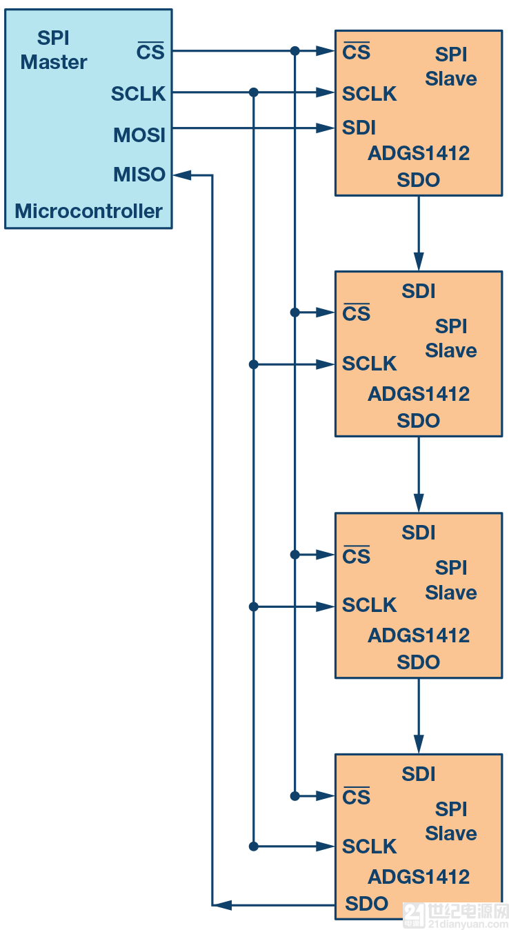另一種方法是使用SPI控制的開關(guān)。此方法的優(yōu)點(diǎn)是可減少所需GPIO的數(shù)量,并且還能消除外加串行轉(zhuǎn)并行轉(zhuǎn)換器的開銷。如圖12所示,不需要16個微控制器GPIO,只需要7個微控制器GPIO就可以向4個ADGS1412提供SPI信號。