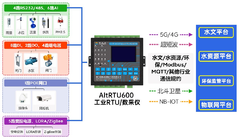 AltRTU600集視頻圖像監控、水利數據采集、無線通信傳輸于一體;智能采集上報雨量、水位、水量、水質等信息;符合水利行業規約、遵循水文水資源認證標準,接口豐富,可擴展性強。